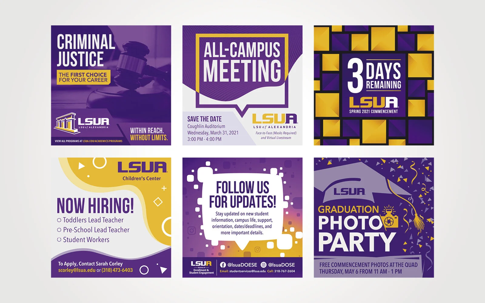 LSUA offers a wide range of popular course selections, maintains affordable costs, and is conveniently located in Central Louisiana. Communications should prominently and concisely present the university’s benefits to audiences. LSUA envisions itself as a university of choice, recognized for academic excellence, placing student careers first, and esteemed as a contributor to the growth of the local community. Therefore, the marketing strategy and collateral are held to a high level of standards with the sole purpose of establishing LSUA as a prestigious institution that leads by example.